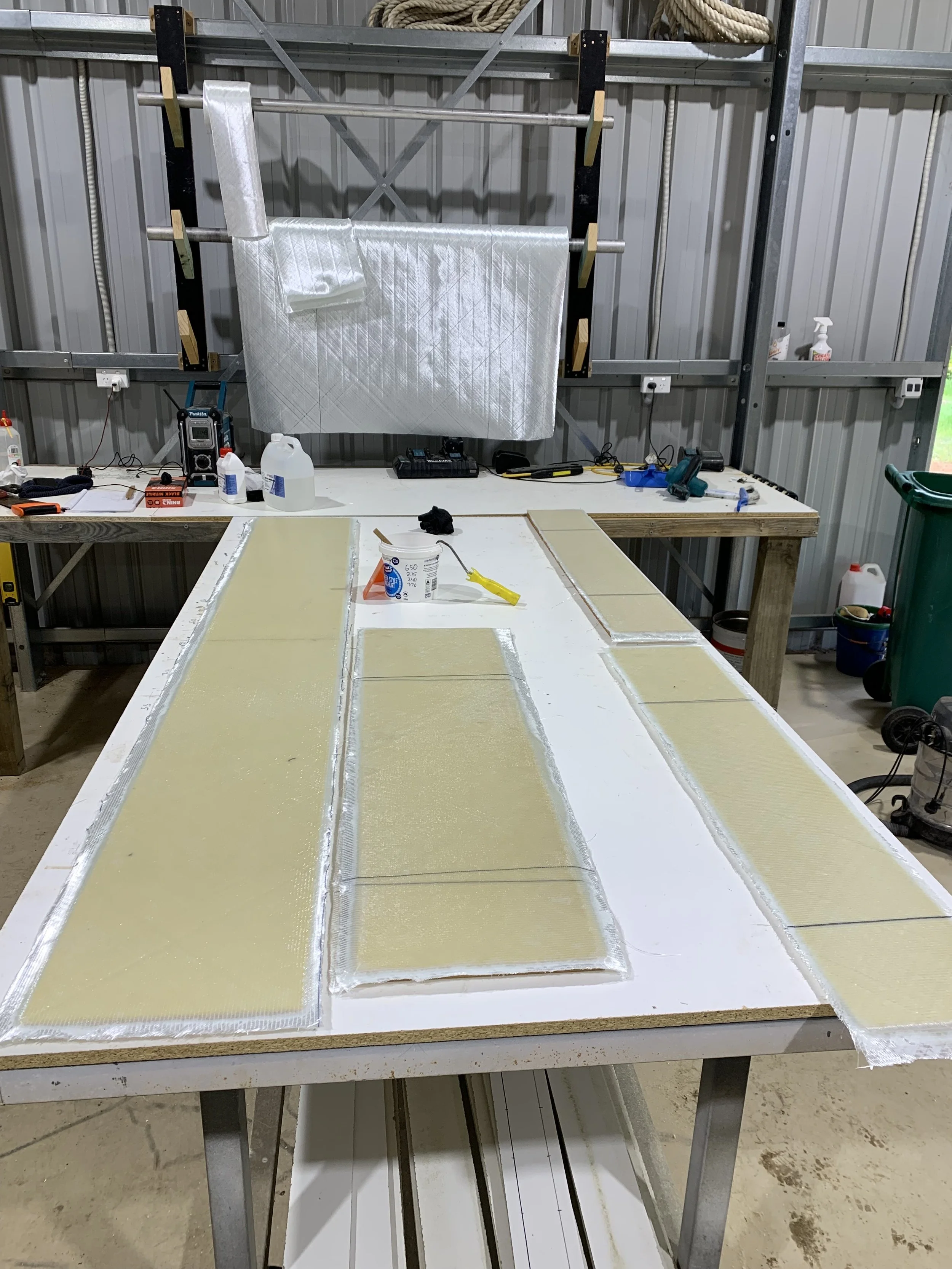 Another job we could do was creating the foam biscuits required for joining some of the larger sections. Each 2400x1200 panel comes with a Z join pre-made on the long side; but for areas like the bridge deck, main bulkheads, cabin top, etc, a join is needed on the short side. To achieve this, we will de core the foam from the laminate, and insert a ‘biscuit’ to create the join. The location of the join determines the thickness required for the biscuit, which is just a piece of foam laminated with 2x 400gm glass each side. It was a good chance to test out a few different methods of glassing with the epoxy - we’ve seen some builders exclusively use squeegees to push out any air bubbles and wet out the cloth, whereas with our previous vinyl ester projects we had just used a few different types of fibreglass rollers. And then we’d seen some home builds just use a foam roller to whack some resin on and left it at that…