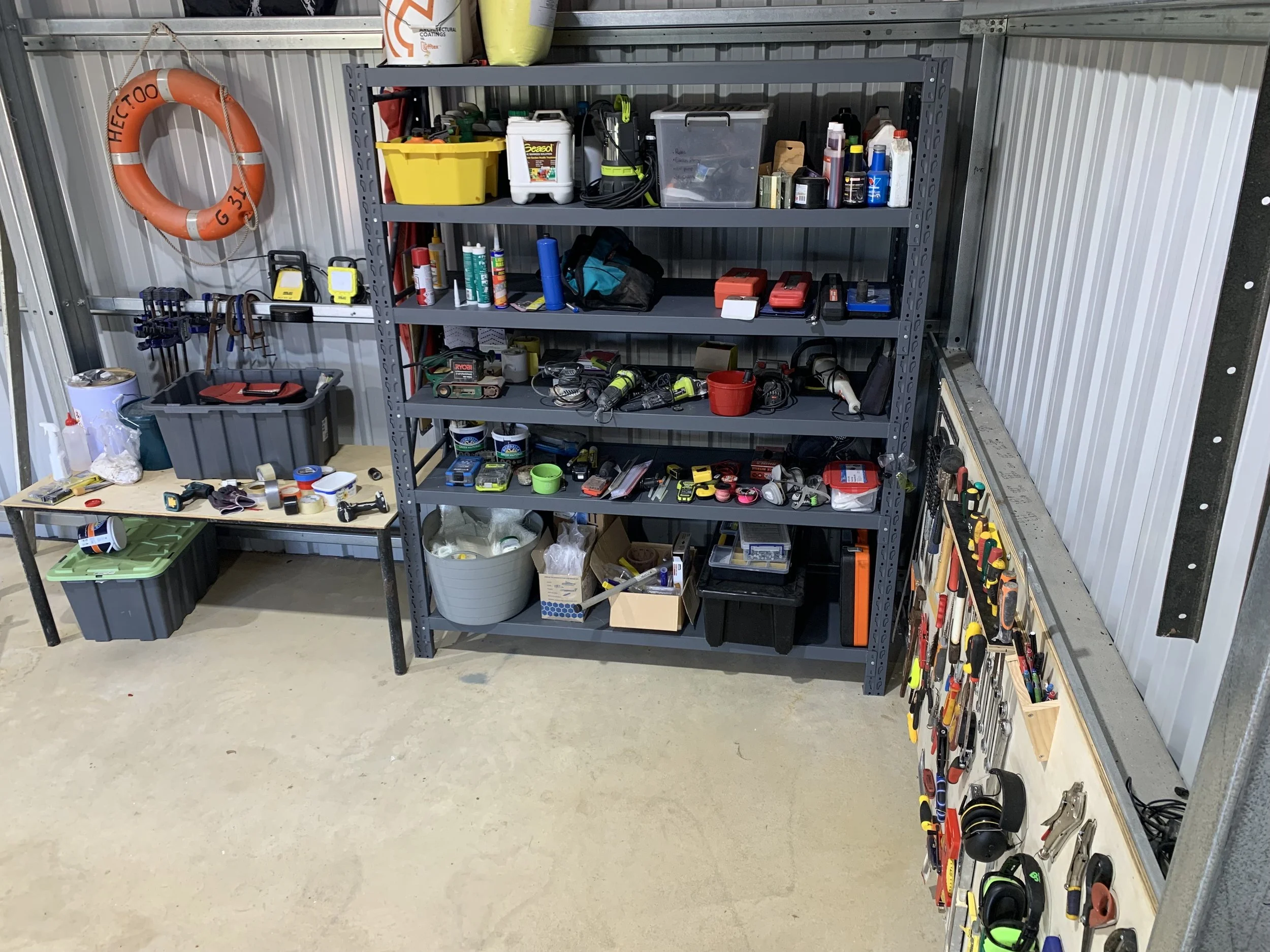 As well as the purge, we re-arranged all the existing shelving and racks. We’re trying to think a few steps ahead, because once these hulls are joined, we know we’ll have only a small gap down each side of the boat. So our workbench will be re positioned at the bow, and racking on the port bow (basically in a corner of the shed). The west facing side of the shed will be left with nothing on it, a clear path for the boat to come out of the shed when we take down the west wall (in however many years that takes). The south side has our roller doors, and will continue to be the main access for the shed.