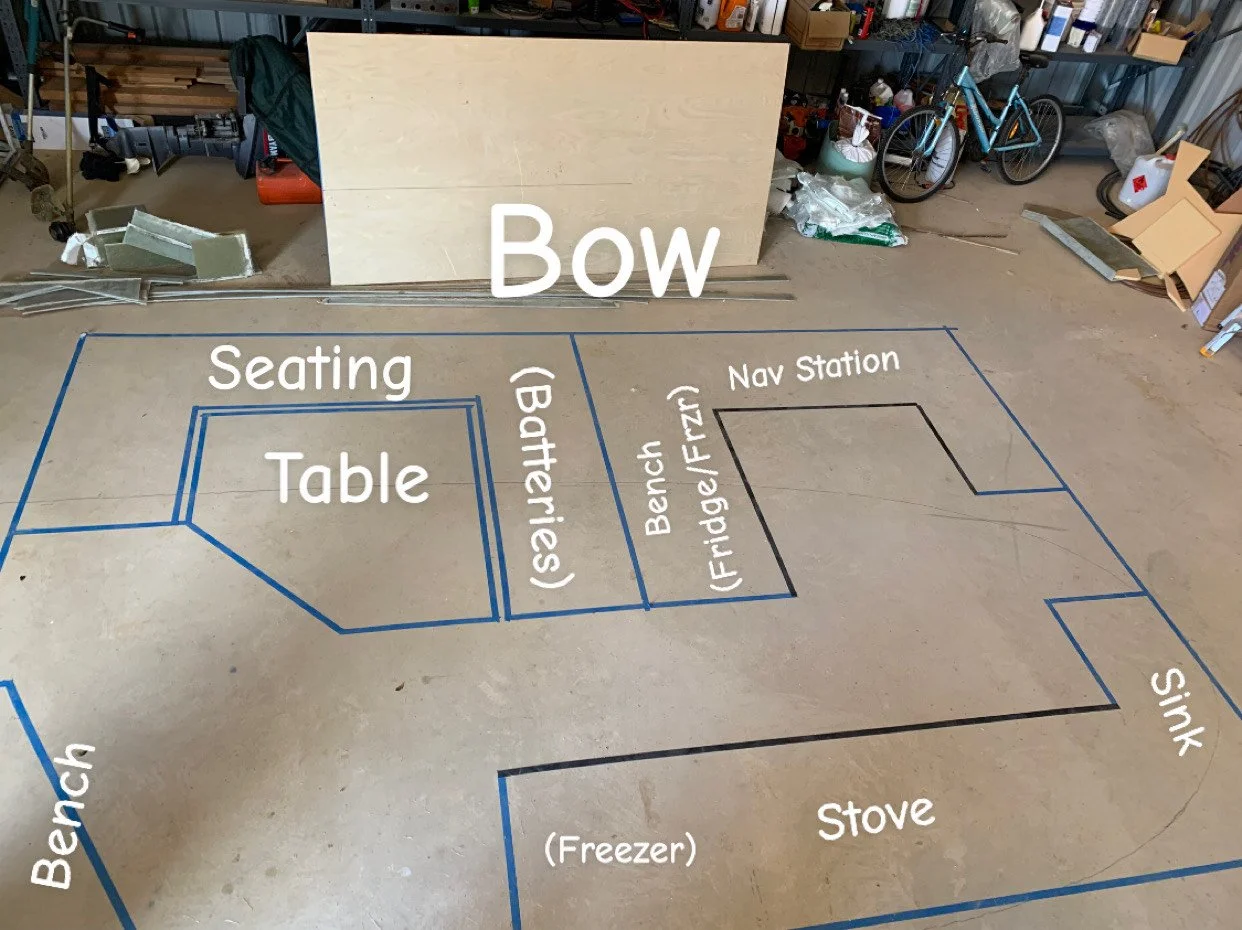 Jumping back in time a little, before our clean up, we were able to get a rough cabin floorplan taped out. Felix used his CAD software to measure up the basic layout, which I then plotted out on the floor.